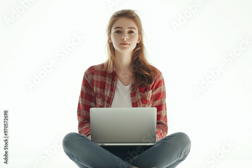 © HEPJAM ai & 3D PNG, Naklejka premium Happy relax time , young woman using laptop sitting on white background