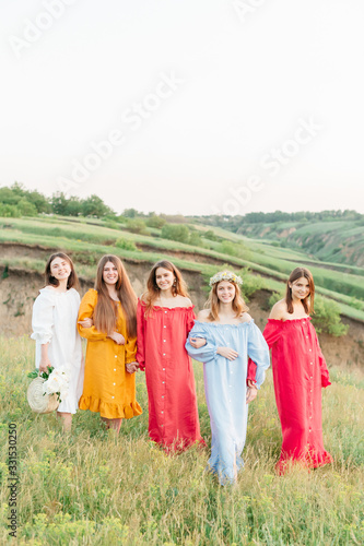 © smishura, Obraz premium Happy relaxing friends on picnic in park, young beautiful girls having fun while spending time together in the summer garden. Women outdoor friendship concept.