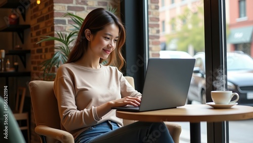 © Hassan, Naklejka premium Happy Remote Work: Young Woman Productively Using Laptop in Cafe