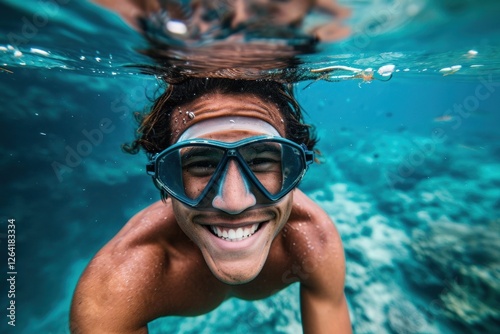 Naklejka premium Happy samoan young diver diving underwater recreation swimming.