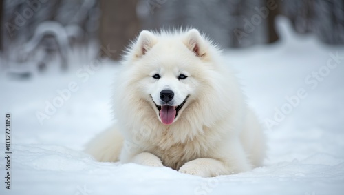 Obraz premium Happy Samoyed dog blending with snow smiling contently