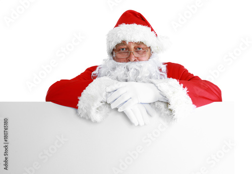 © lenets_tan, Naklejka premium Happy Santa Claus looking out from behind the blank sign isolated on white background