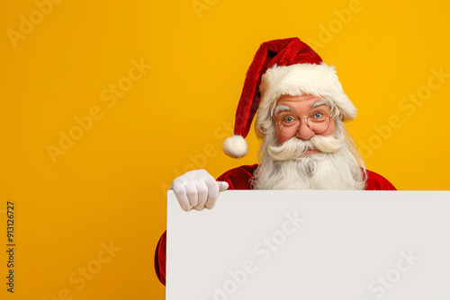 © RicardoLuiz, Naklejka premium Happy Santa Claus Peeking Over Blank Sign On Yellow Background