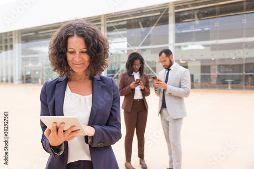 Obraz premium Happy satisfied business woman using tablet outside office building. Her male and female colleagues using mobile phones in background. Wireless internet connection concept