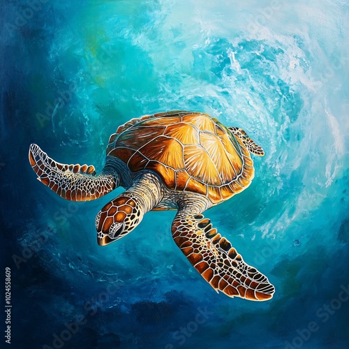 © Tam, Obraz premium Happy Sea Turtle Swimming in Clear Ocean Waters