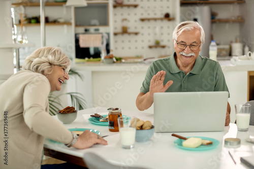 Obraz premium Happy senior couple making video call over laptop while having breakfast at...