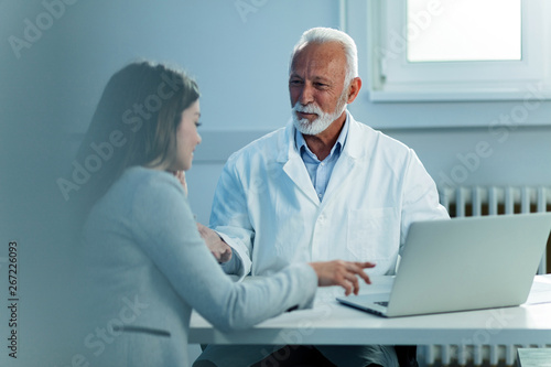 © Drazen, Obraz premium Happy senior doctor talking to female patients while using laptop during consultations.