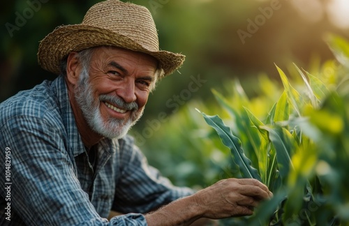 Fototapeta premium Happy Senior Farmer in Field with Corn Sprouts