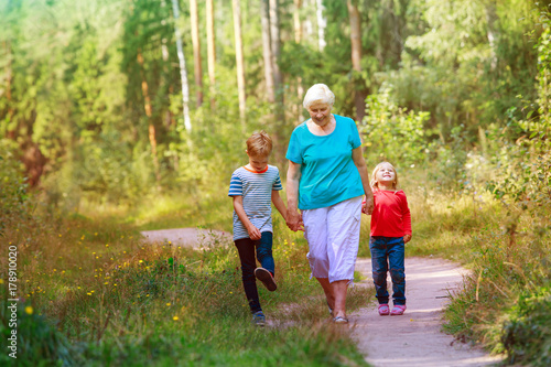 Fototapeta premium happy senior grandmother with kids walk in nature