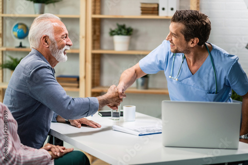 © Drazen, Fototapeta premium Happy senior man and doctor shaking hands while meeting at doctor's office.