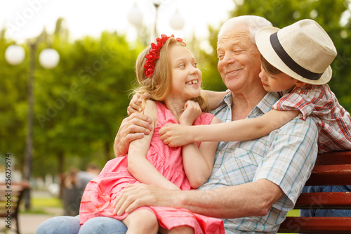 Obraz premium Happy senior man relaxing outdoors with his grandkids