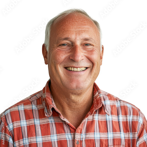 © Anha, Fototapeta premium Happy senior man smiling in red plaid shirt isolated on a transparent background