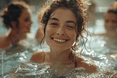Obraz premium Happy senior women doing aqua fitness in a pool, enjoying retirement with joy...