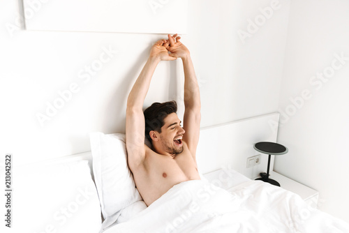© Drobot Dean, Fototapeta premium Happy shirtless man stretching his hands while laying