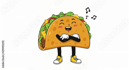 Fototapeta premium Happy singing taco cartoon with cheese, eyes closed, and musical notes