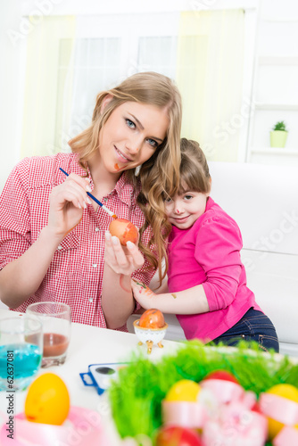 Fototapeta premium Happy sisters coloring Easter eggs and looking at camera