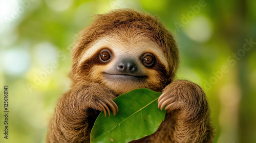 © Pisahouse, Fototapeta premium Happy sloth, A sloth reaching for a leaf, embodying tranquility and happiness in a high-fidelity image.