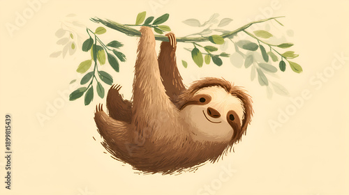 © utaem2022, Obraz premium Happy sloth hanging from tree branch enjoying nature