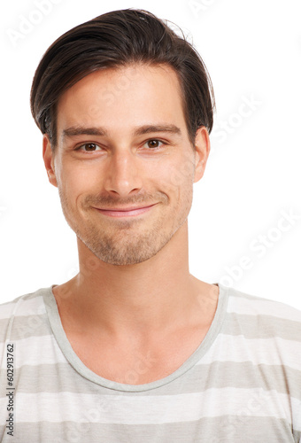 © DK Casting/peopleimages.com, Obraz premium Happy, smile and face with portrait of man in studio for casual, trendy and cool. Happiness, young and confidant with Switzerland model isolated on white background for confident, youth and style