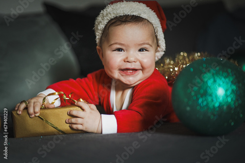 © shellygraphy, Obraz premium happy smiling baby boy in red santa claus costume lying with christmas hat and gifts or presents at home in the living room