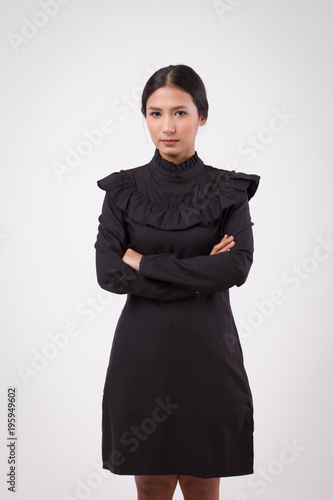 © 9nong, Fototapeta premium happy smiling confident woman portrait; relaxed positive happy woman smiling studio isolated; woman smiles with happy confident face expression; adult asian woman model