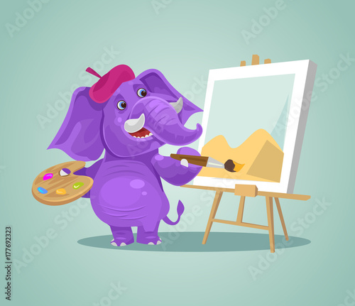 Naklejka premium Happy smiling elephant character artist drawing. Vector flat cartoon illustration