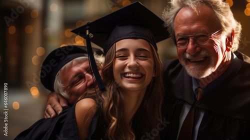 © Studio Nova, Fototapeta premium Happy smiling graduate hugs his parents after the graduation ceremony.