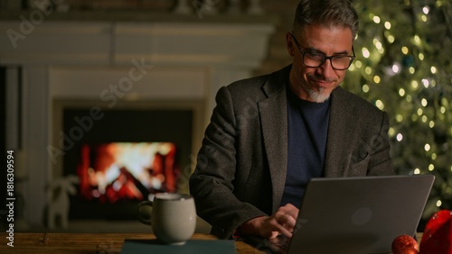 © nyul, Naklejka premium Happy smiling mid adult man using laptop computer at home, sitting at desk in Christmas decorated cosy room. Fireplace and Christmas tree in background. Businessman shopping online searching for gift.