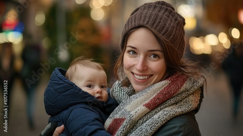 Obraz premium Happy smiling mother with baby girl in carrier walking through city