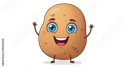 Obraz premium Happy Smiling Potato Character with Waving Hands on Plain White Background, Cute Vegetable Cartoon