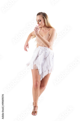 Naklejka premium Happy smiling woman dancing latino dances and looking down. Full body length portrait isolated on white studio background.