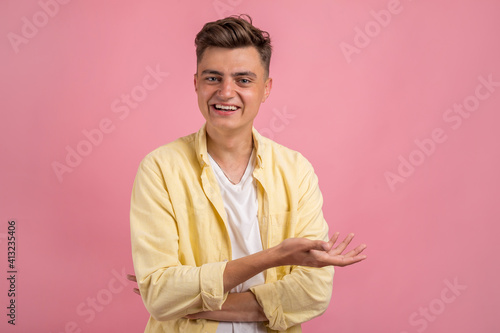 © Oleksandr Kozak, Obraz premium Happy smiling young man presenting and showing your text or product isolated on pink background