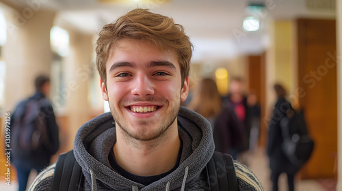 © Tahsin, Fototapeta premium Happy smiling young man student portrait casual grey hoodie boy face smile model people person joyful
