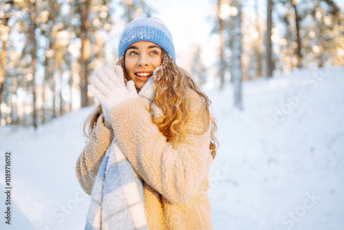 Obraz premium Happy smiling young woman portrait dressed coat scarf hat and mittens enjoys winter weather at snowy winter park.