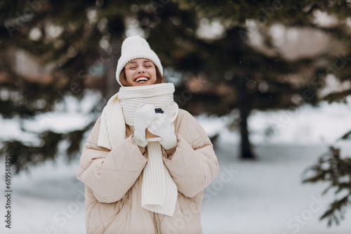 Obraz premium Happy smiling young woman with coffee hot drink cup enjoys winter weather at...