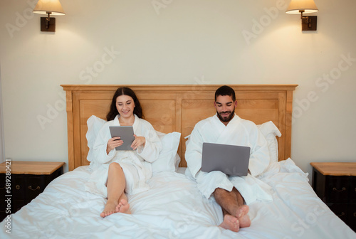 Fototapeta premium Happy Spouses Browsing Internet On Computers Sitting In Bed Indoors