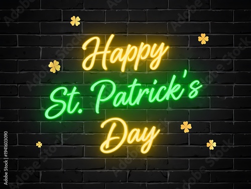© MstEva, Obraz premium Happy St Patricks Day neon sign on brick wall with shamrocks