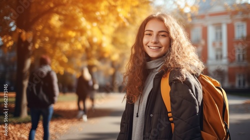 © Jorge Ferreiro, Fototapeta premium happy student with a backpack and a blurred school background