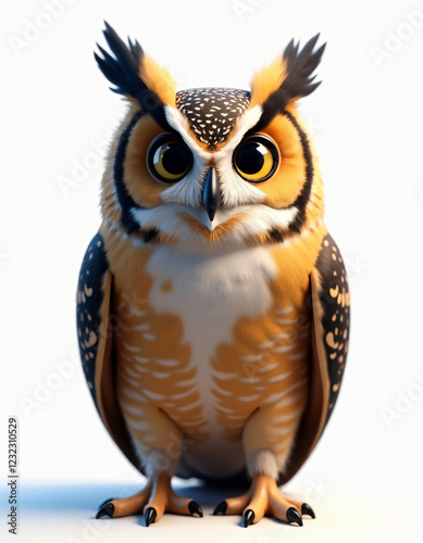© Mikhail, Fototapeta premium Happy Stylized Owl with Wings Spread, Adorable 3D Wild Animal Illustration