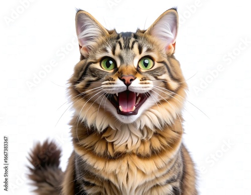 © Rindi, Obraz premium Happy Tabby Cat With Mouth Open And Wide Eyes Looking Directly At Camera.