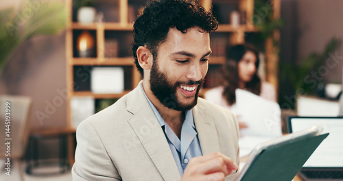 Fototapeta premium Happy, tablet and businessman in office for research, online budget review and finance proposal. Professional, accountant and person on digital tech for website, financial consultant and planning