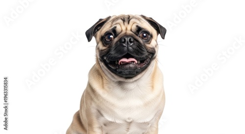 © RONNY, Fototapeta premium Happy, tan pug smiling with its tongue out against a white backdrop