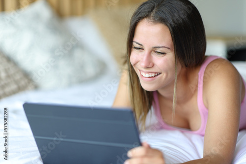© Antonioguillem, Fototapeta premium Happy teen using tablet in the bed