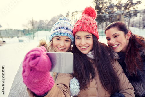 Fototapeta premium happy teenage girls taking selfie with smartphone