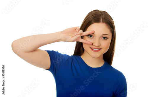 Fototapeta premium Happy teenager with victory sign on eye.