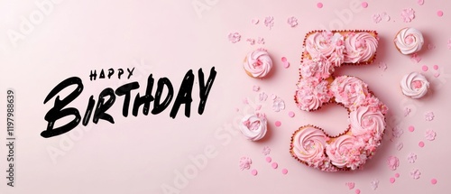 © Fernando, Naklejka premium Happy 5th Birthday Cake Number Shaped Cupcakes Pink Background