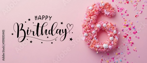 Naklejka premium Happy 6th Birthday Cake with Pink Sprinkles and Confetti
