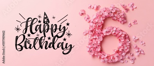 Naklejka premium Happy 6th Birthday Floral Arrangement: Pink Flower Number Six with Festive Text