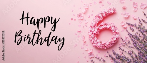 Naklejka premium Happy 6th Birthday Floral Arrangement: Pink Flowers and Lavender Design