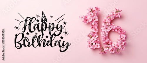 Naklejka premium Happy 16th Birthday Floral Arrangement: Pink Flowers Number Sixteen